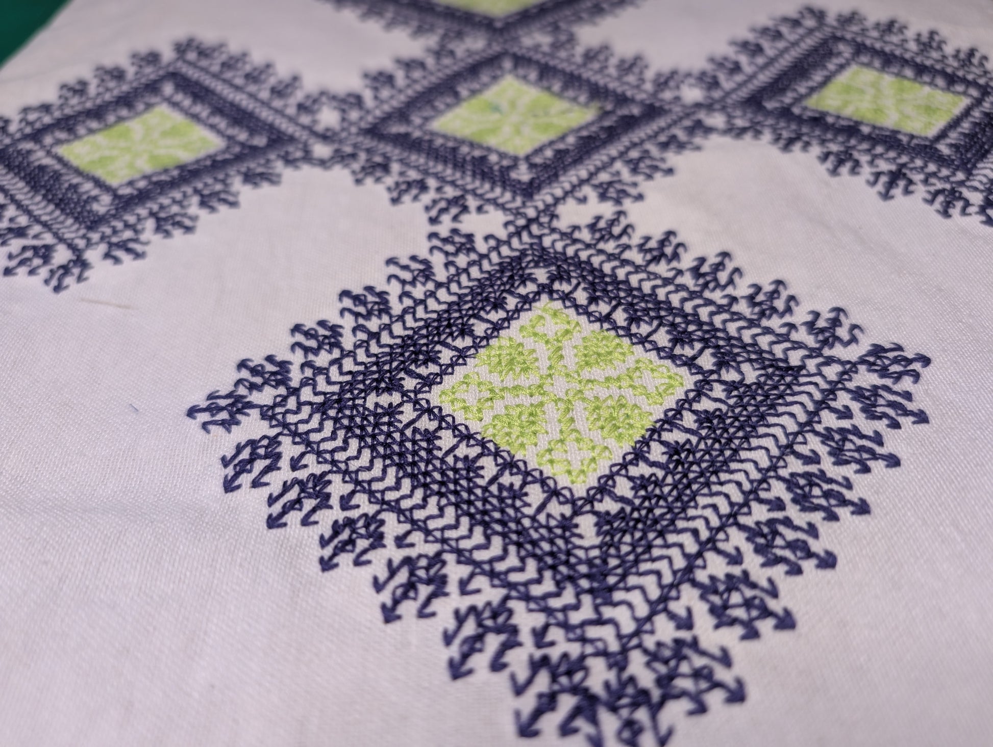 The embroidery is crafted by hand, reflecting the skill and patience of the artisans. Fez embroidery is always double-sided.