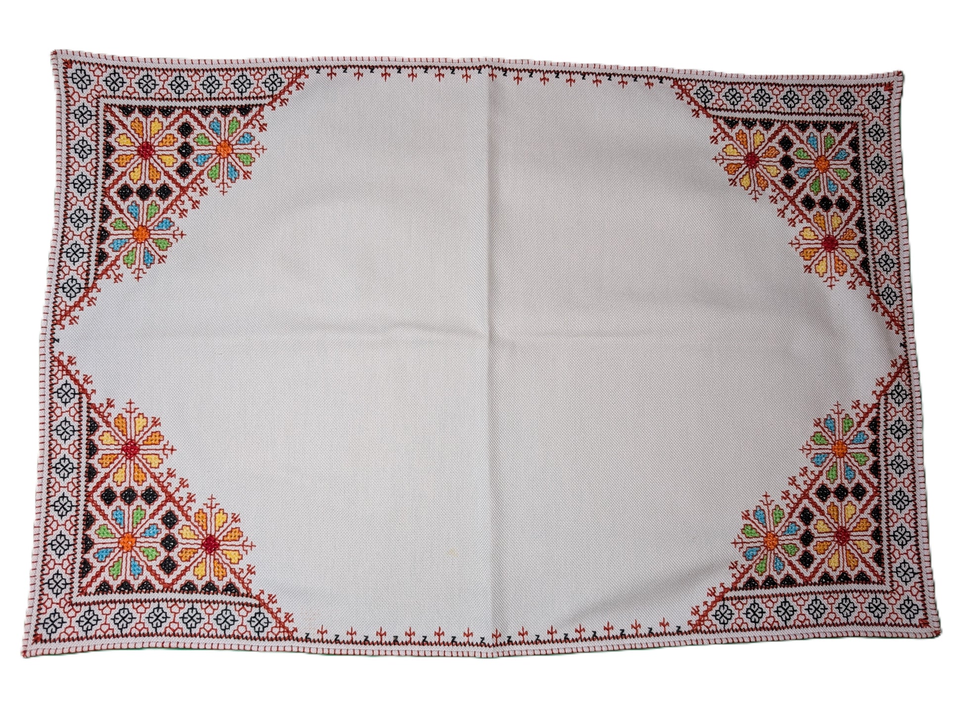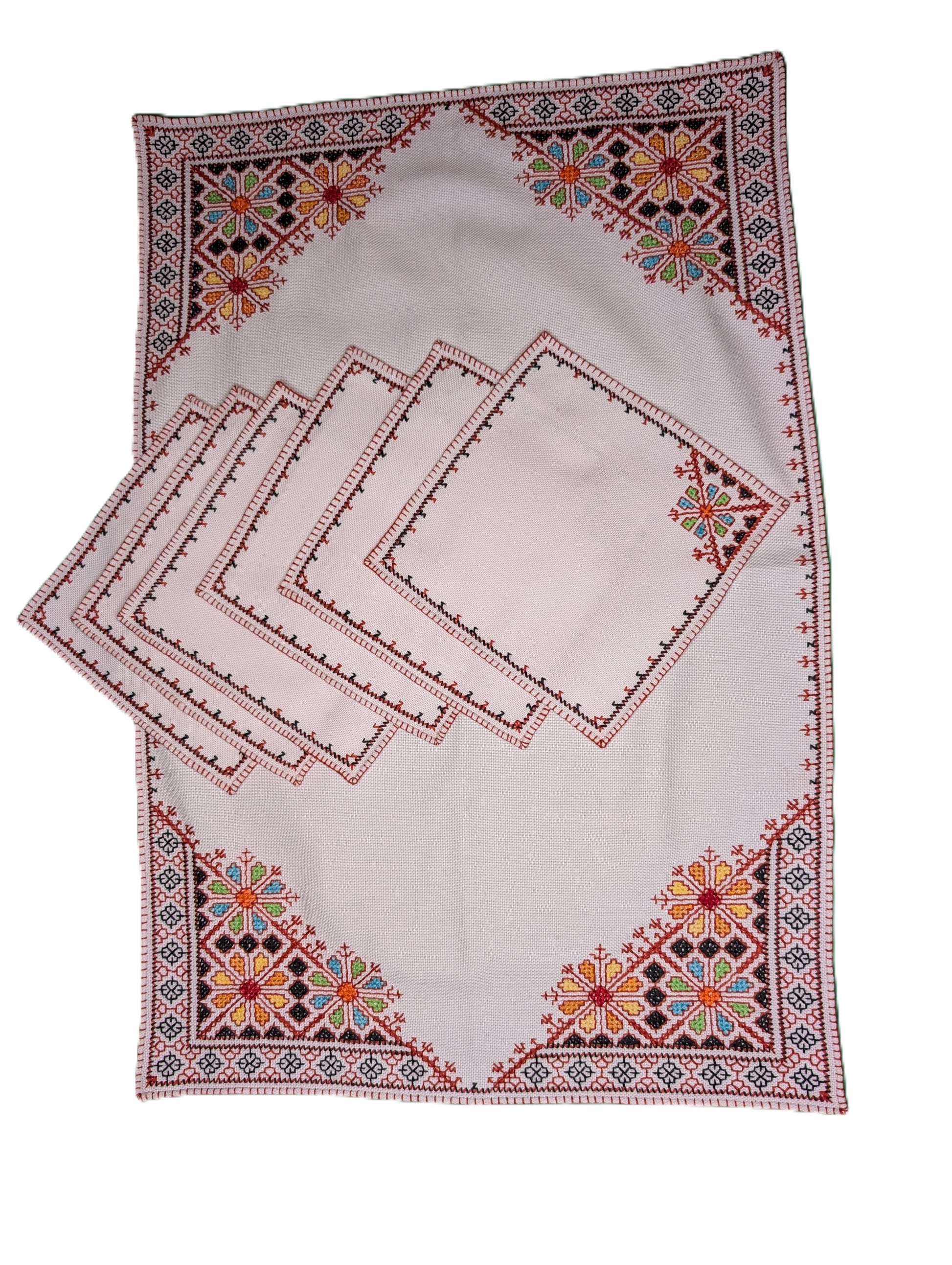 Table Cloth with 6 napkins Fassi Multi-color embroidery on White background / Nappe avec 6 serviettes Broderie Fassi couleurs sur fond Blanc