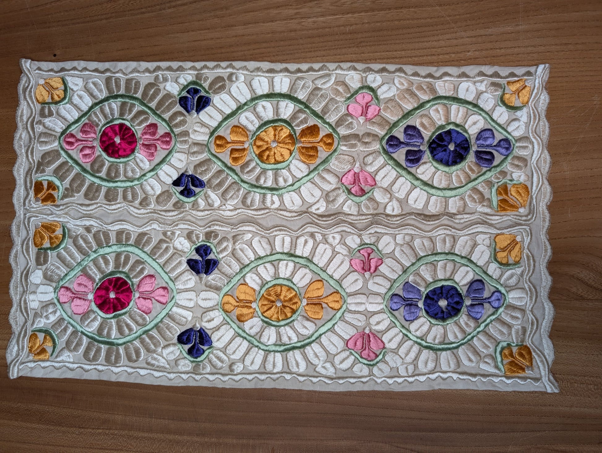Ce type de broderie est réputé pour ses motifs complexes et détaillés et ses couleurs vives, généralement sur des tissus comme la soie, le coton ou la laine.